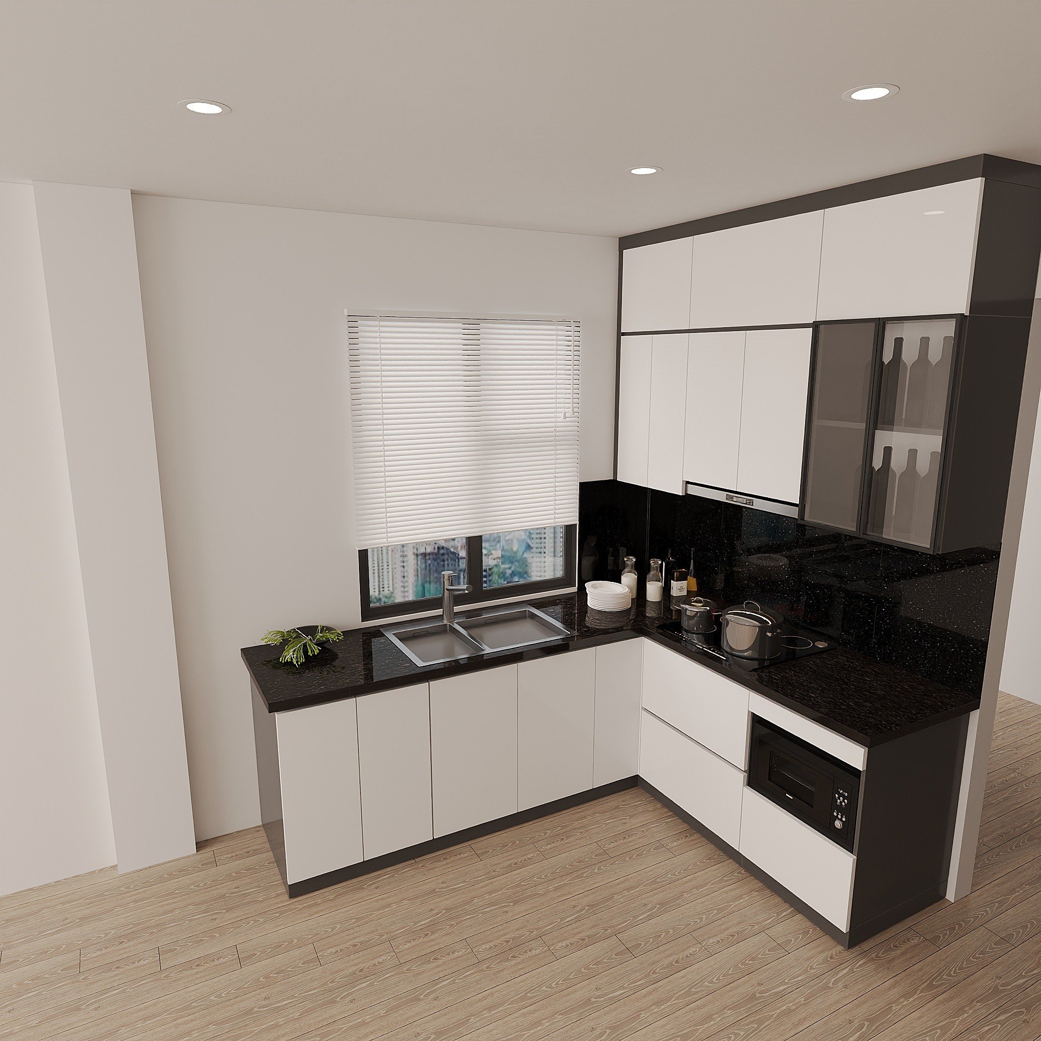 - Thiết kế tủ bếp chữ L có cửa sổ