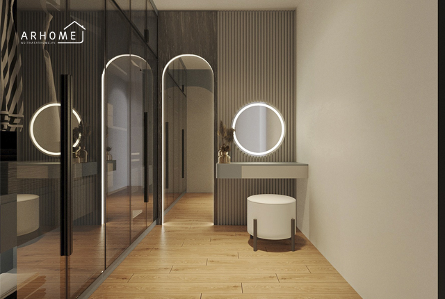 Đồng thời, bố trí tủ quần áo thông minh và tiện ích cũng rất quan trọng. Đồng thời phòng thay đồ nên được thiết kế với các kệ đựng quần áo, túi xách và giày dép một cách gọn gàng, hiện đại. Ngoài ra, việc có một góc trang điểm riêng biệt với đèn chiếu sáng tốt, gương toàn cơ thể và không gian để trang điểm cũng rất quan trọng.