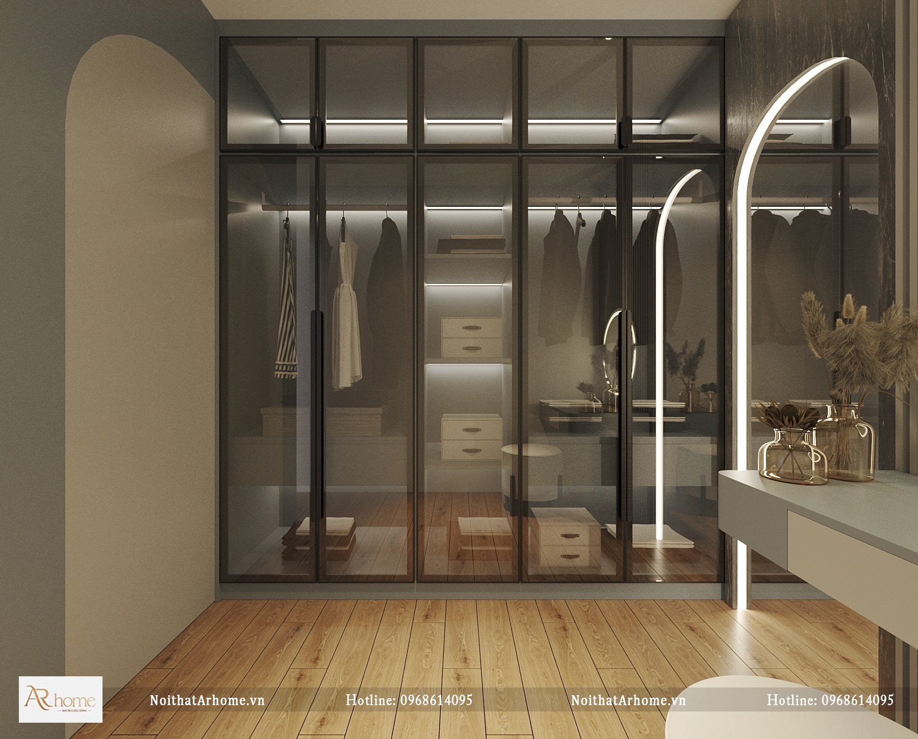 Bên phải là phòng thay đồ bao gồm tủ áo khung nhôm hệ kết hợp cánh kính cường lực, bàn trang điểm và gương soi toàn thân, kết hợp đèn led trang trí.