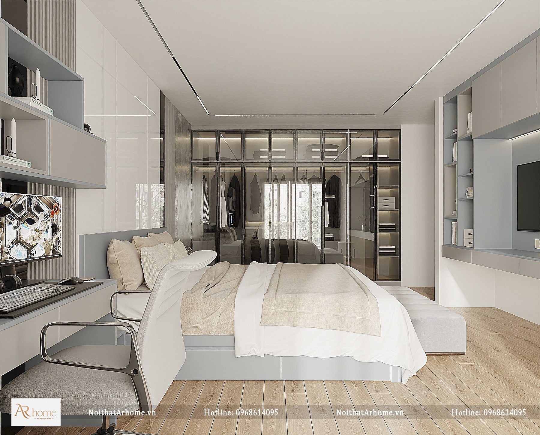 Với một phòng ngủ Master 30m2 khá rộng với đầy đủ công năng, NoiThatArhome đã thiết kế thành 2 phòng tách biệt giúp tối ưu không gian bao gồm một phòng thay đồ và phòng ngủ riêng biệt.